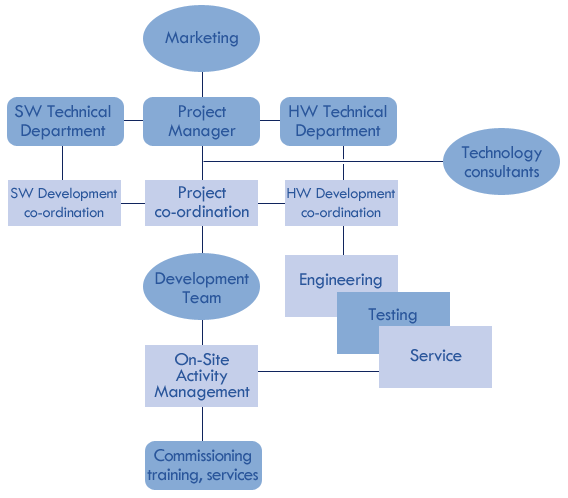 We can assist clients with project management, from small revamp installations to full turnkey projects. In co operation with the client, our engineers will ensure timely completion of projects within the budget and in accordance with international quality control standards and specifications. Planning and forecasting of project concepts, goals and objectives are continuously monitored and corrective actions initiated. A typical Operative Project Development Team Structure is as follows: